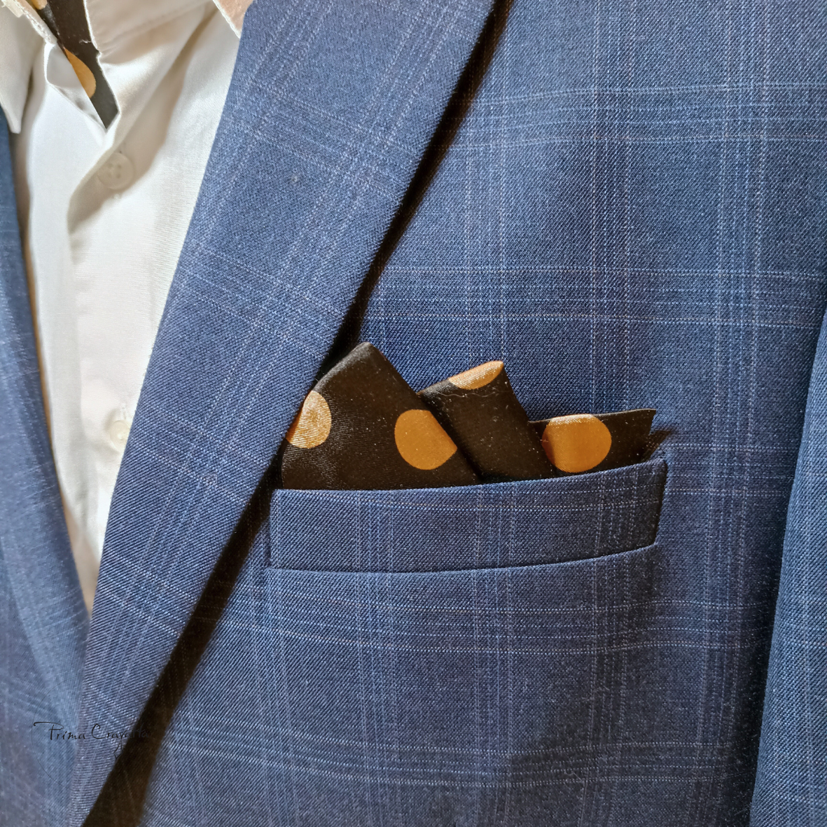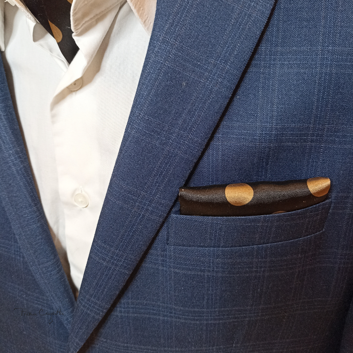 Kahekihiline šokolaadipruunist pehmest atlasskangast kuldsete mummudega pintsaku taskurätik.